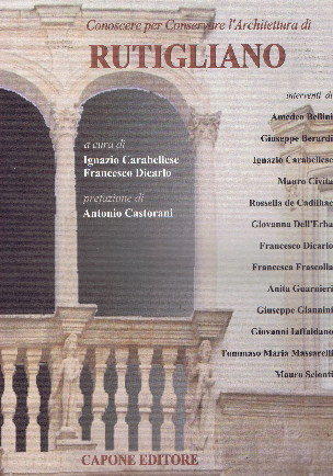 Questo volume è frutto dell'intenso e impegnativo lavoro condotto dal gruppo dei colleghi architetti che fanno capo alla cattedra di restauro Architettonico del Politecnico di Bari. Esso ha il duplice scopo: di documentare alcuni dei manufatti edilizi di interesse storico e/o artistico che qualificano Rutigliano come uno dei numerosi centri, ricchi di interesse storico e artistico della nostra provincia; di esplicitare analiticamente le motivazioni, la necessità e l'urgenza della tutela. Ciascuno di tali manufatti, anche il più semplice, è realizzato con profonda aderenza alle ragioni che esistenzialmente determinano, la modalità di vita delle persone e delle collettività in ciascun luogo. Ogni muro, ogni volta, racchiude e tramanda la sapienza costruttiva che, di generazione in generazione , si è qui arricchita e perfezionata.