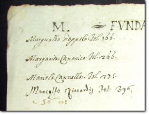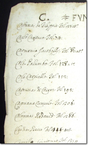 Negli indici antichi l’ordine alfabetico non tiene conto delle famiglie (cognome), ma del nome; ancora a metà Settecento, quando i cognomi erano ormai ben affermati, il catasto onciario, pur organizzato per fuochi (famiglie), è ordinato per nomi.