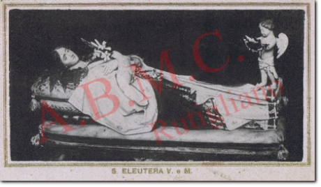 da una ricognizione successiva apprendiamo che il Card. Gennari (già Vesc. Conversano 1881-97) riportava essere le reliquie del "Corpus Sanctae Eleuterae Martyris nom. proprii cum vasae sanguinis inventum in coemeterio Callisti sub die 5 maij 1821"